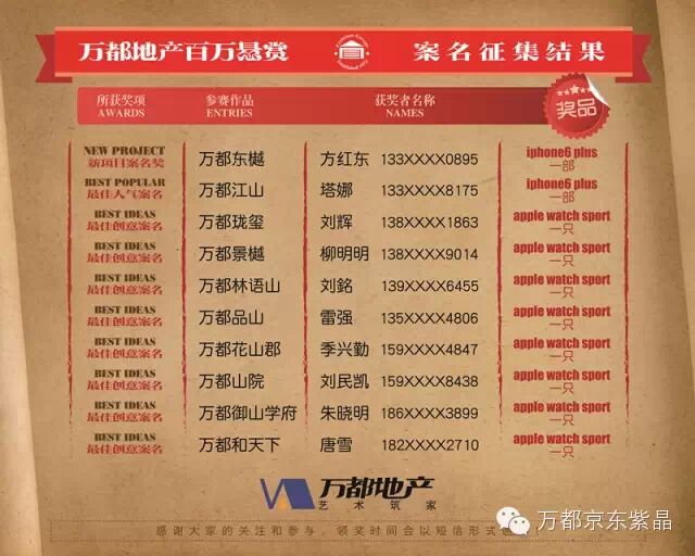 其中得票最高的为“万都江山”,而“万都东樾”被选择为新项目的推广案名!两位案名命名者,将分别获得由万都地产送出的iPhone6 plus 一台,其余八位将分别获得由万都地产送出的apple watch sport 一只!恭喜...