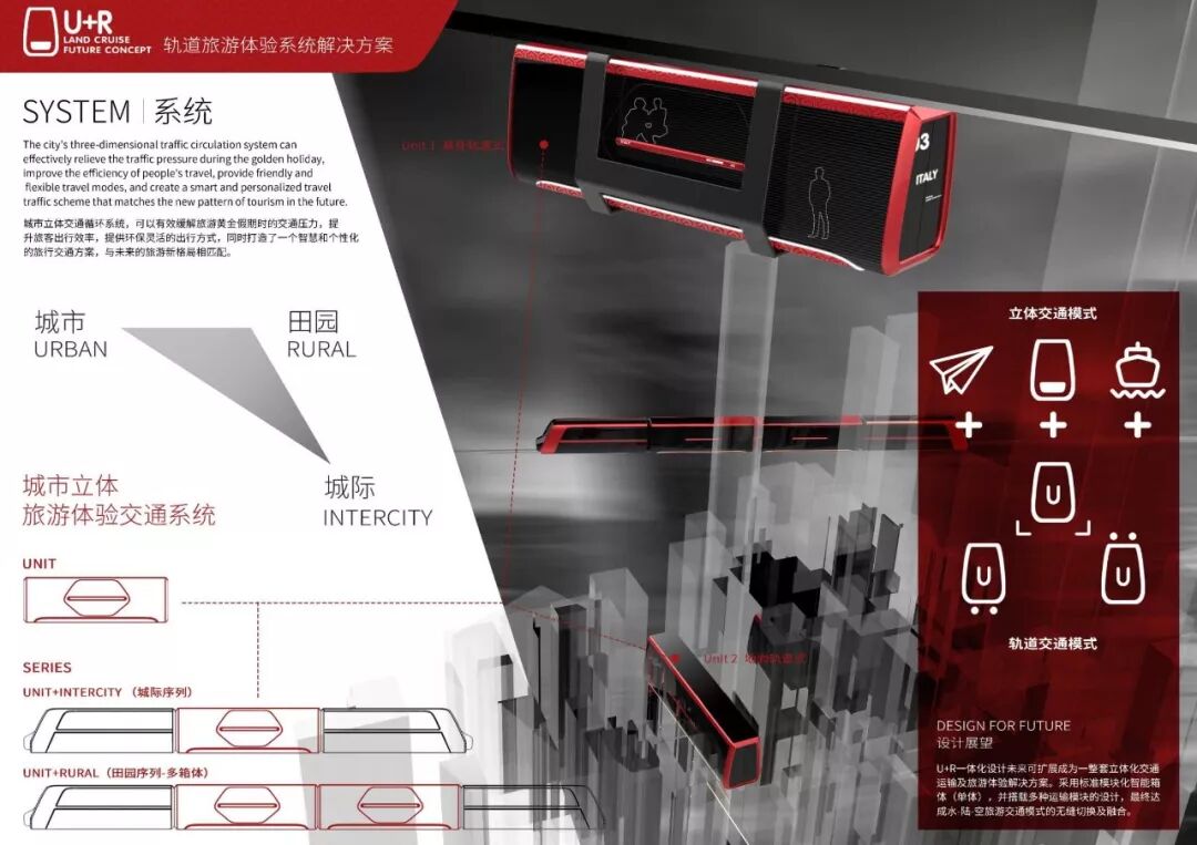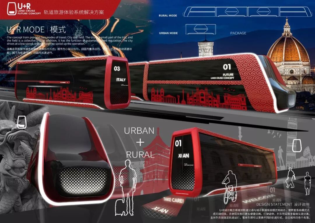 “U+R”概念列车致力于打造城市+野外的休闲、文化、娱乐、购物等于一体的立体交通循环系统新路径,从产品-模式-体验-系统四个维度打造列车,既能满足游轮概念,又能有效输出文化,以实现全景式覆盖、全产业发展、全季节体验、全社会参与的大旅游格局。灵感源自西安城门、中国龙和秦代皮甲,整体车身行驶时放佛一条腾飞的巨龙,旨在将中国文化带到世界各地。列车分为两个部分,车头车尾和中间车体,适用于城市、田园和城际。其中车头车尾为卧舱,侧向为观光舱,一层为普通车厢,二层为VIP和普通混合车厢,以提供个性化旅游服务。