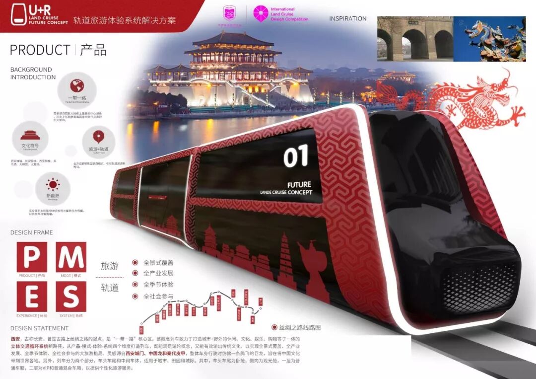 设计方向设定为面向中国,辐射亚欧,运行在“陆上丝绸之路经济带”沿线的观光旅游列车。列车运行轨道采用高架磁悬浮设计,维护工作量低,无噪音、不排出有害气体、对地面生态破坏较小,使列车对环境影响降到最低。车厢采用双层设计,上层为个人或团体空间,下层为公共活动区域,通过功能分区,满足旅客中长途旅行中的不同需要。列车为沿途观景添加了双层落地窗、透明玻璃地板专用观景车厢、中途空中平台等设计,方便乘客全角度俯瞰“一带一路”沿线壮丽风光。