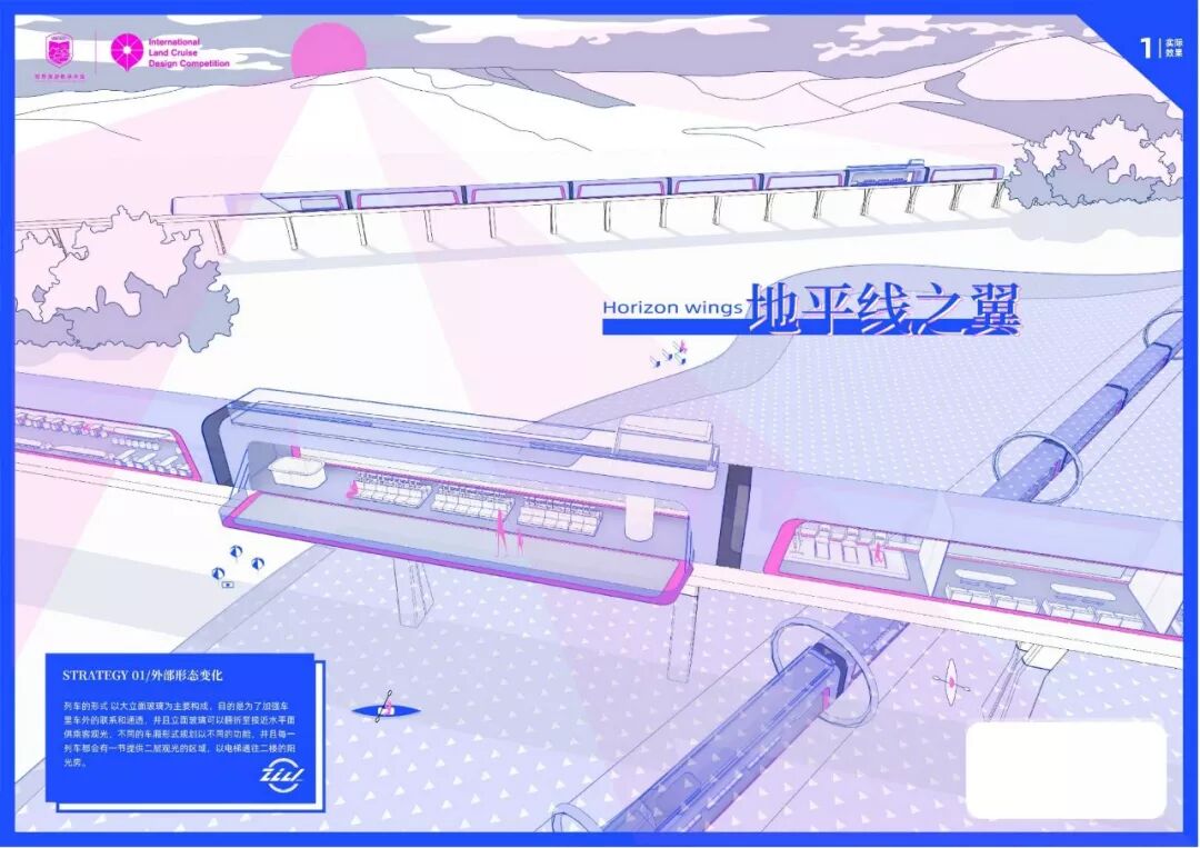 陆地邮轮不仅是出行,也是文旅。本设计将功能进行分区,采用分立融合式双层设计。外饰双层叠加,流动的线条增加设计的运动感,经典中国白的色彩增加辨识度。内饰进行功能分区,下层设有乘坐、休息功能区;上层设有是观光、娱乐休闲、餐饮功能区;两层之间通过楼梯上下相通。每节车厢上层设计有包围式全透明玻璃,满足用户观光的需求,当驶入景区区域时,车速会降低,上层玻璃开启,用户可更加直接地亲近自然,感受文化的气息,护栏的设计来确保用户的安全。月台采用可上下滑动设计,充分利用上层空间,方便用户快速地进出列车。更好的实现全景式、全季节的出行旅游体验格局,驶向更多的未知风景和文化。
