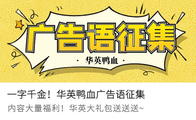 广告语准确切合华英品牌文化,充分体现华英鸭血产品特点。朗朗上口,富有美感,雅俗共赏,便于传播,具有强烈的感召力和吸引力。