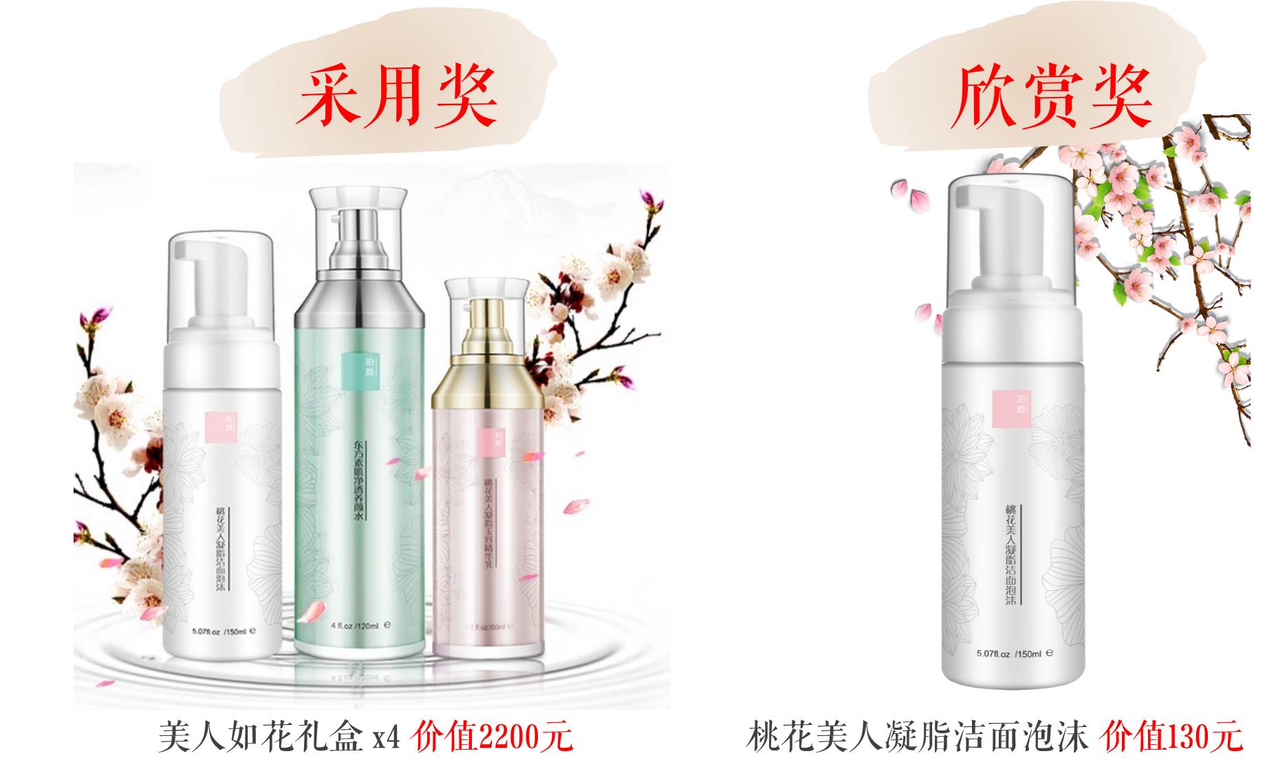 奖品1:【采用奖】获赠珀颜一年的桃花系列护肤品,每季度寄出1套美人如花礼盒(桃花美人凝脂洁面泡沫+桃花美人凝脂玉容精华乳+东方素肌净透养颜水),共送出4套,总价值:2200元。可换等值产品。奖品见下图。