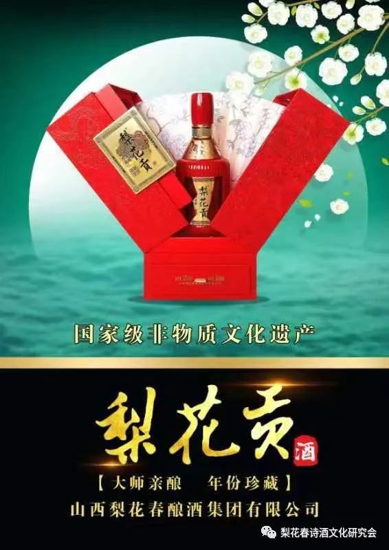 5、寻寻觅觅花枝俏,山西贡酒梨花春。醇(纯)正清香,梨花贡酒,你的53度情怀。